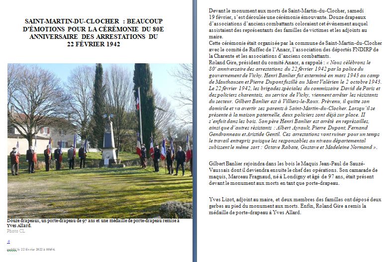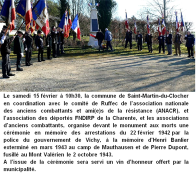 2020 - SAINT-MARTIN-DU-CLOCHER: CÉRÉMONIE EN MÉMOIRE DES MARTYRS ARRÊTÉS EN 1942